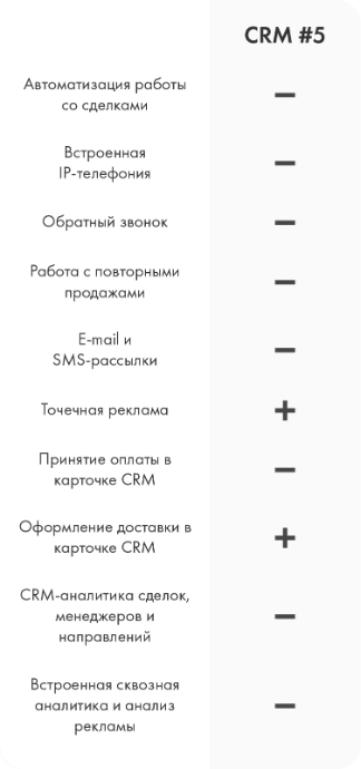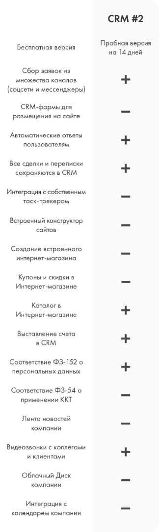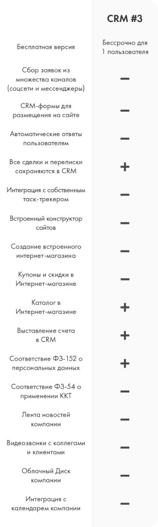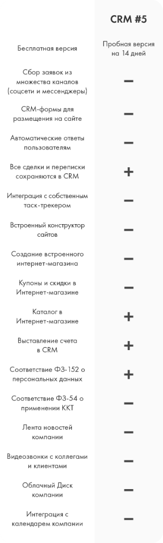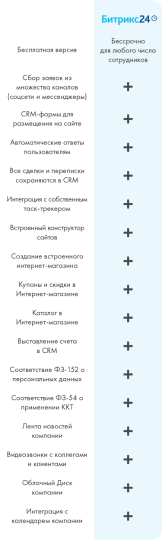 В таблице ниже представлен инструментарий Битрикс24.CRM, доступный на старте в бесплатной версии, в разрезе сравнения с бесплатным набором других ведущих систем на российском рынке.